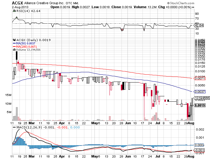 ACGX is currently priced at $.0019 and has a small market cap of $230k. The company reported First Quarter Revenues of $2,457,105 for 2013 and a Gross Quarterly Profit of $683,515!